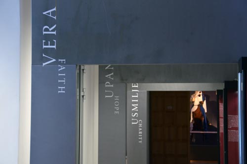 NMS - Otvorenje izložbe 'Vitez, dama in zmaj' - Predvorje izložbe. Sv. Juraj ubija zmaja. U pozadini led displej s prikazima dama. Foto: VJB.