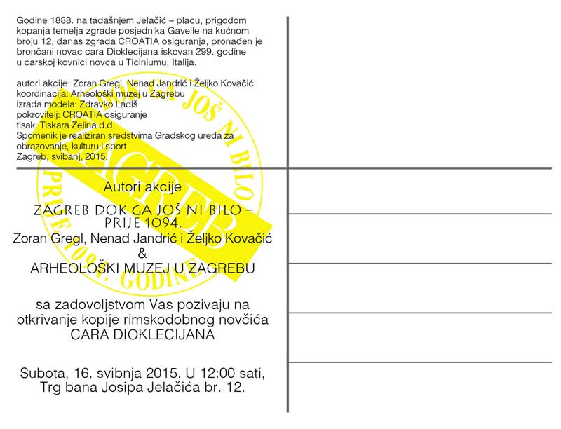 Arheološki muzej u Zagrebu, Zoran Gregl, Nenad Jandrić i Željko Kovačić sa zadovoljstvom Vas pozivaju na otkrivanje kopije rimskodobnog novčića cara Dioklecijana u subotu, 16. svibnja u 12 sati na Trgu bana Jelačića br. 12.