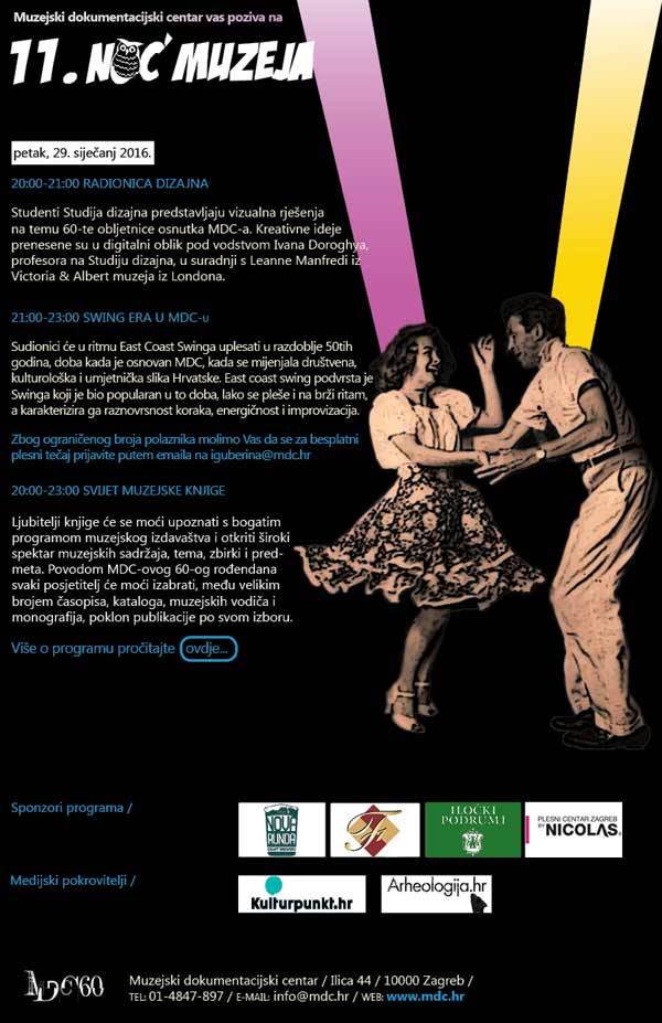 Posjetitelje koji odluče Noć muzeja provesti u Muzejskom dokumentacijskom centru očekuje izlet u prošlost na temu 50-ih i 60-ih godina prošlog stoljeća, vremena kad se osniva MDC i veliki broj hrvatskih muzeja. Program počinje u 20.00 sati predstavljanjem vizualnih rješenja na temu 60-te obljetnice osnutka MDC-a od strane Studenata Studija dizajna Sveučilišta u Zagrebu, a najatraktivniji dio programa svakako je plesni tečaj za odrasle koji će voditi Ksenija Pluščec Quesnoit i Nicolas Quesnoit, svima poznatiji kao pobjednik „Plesa sa zvijezdama“, u sklopu kojeg će sudionici u ritmu East Coast Swinga uplesati u razdoblje 50tih godina – vrijeme Bearnardijeva stolca, Ghetaldusovih naočala, prvih opatijskih festivala…