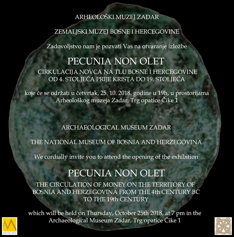 Čast nam je pozvati Vas na otvorenje gostujuće izložbe iz Zemaljskog muzeja Bosne i Hercegovine pod nazivom Pecunia non olet – Cirkulacija novca na tlu Bosne i Hercegovine od 4. stoljeća prije Krista do 19. stoljeća, koje će se održati u četvrtak, 25. listopada. 2018. godine u 19h u Arheološkom muzeju Zadar.