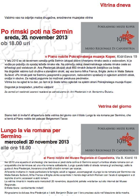 Predavačica, dr. Maša Sakara Sučević, kustosica za arheologiju u koparskom pokrajinskom muzeju, donijet će određene nalaze, koji će biti prezentirani posjetiteljima te kopije brončane figurice psića, koje će se moći kupiti.’