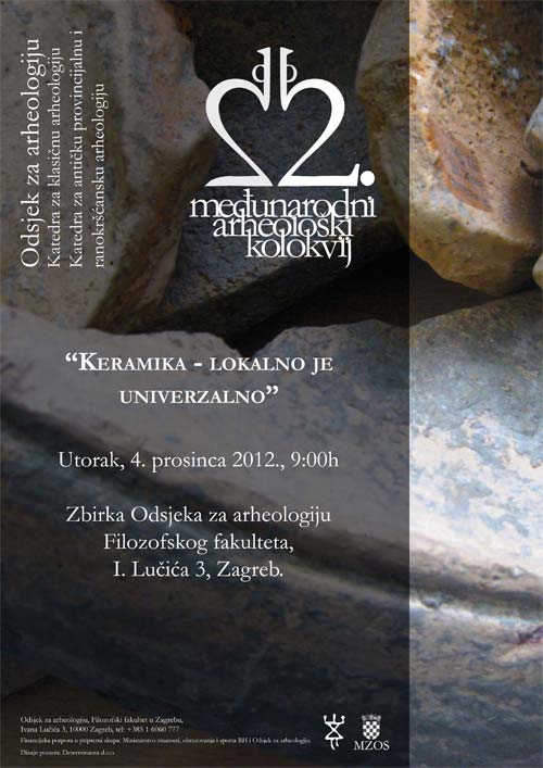 U organizaciji Odsjeka za arheologiju, Katedre za klasičnu arheologiju i Katedre za antičku provincijalnu i ranokršćansku arheologiju Filozofskog fakulteta u Zagrebu, u utorak 4. prosinca 2012. godine u 9 sati u Zbirci Odsjeka za arheologiju Filozofskog fakulteta u Zagrebu, I. Lučića 3, održat će se II. međunarodni arheološki kolokvij – ‘Keramika – Lokalno je univerzalno’.