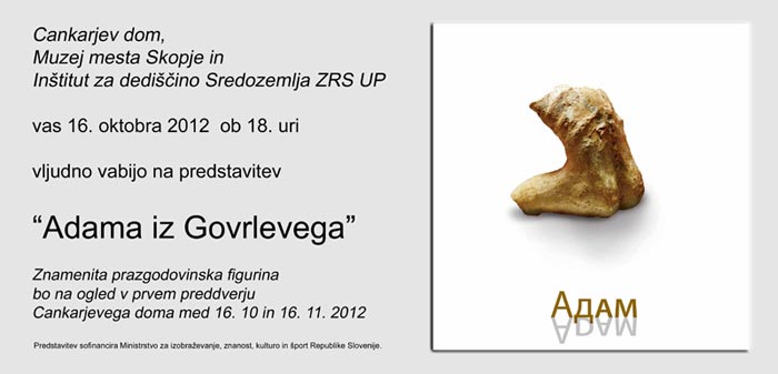 U Cankarjevom domu u Ljubljani, u utorak 16. listopada 2012. godine u 18 sati, održat će se predstavljanje znamenite prapovijesne figure ‘Adam iz Govrlevega’.
